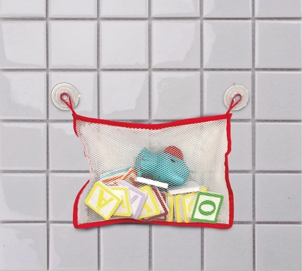 Der Netzbeutel mit Saugnäpfen erleichtert die Organisation und das Trocknen des Spielzeugs in der Badewanne.