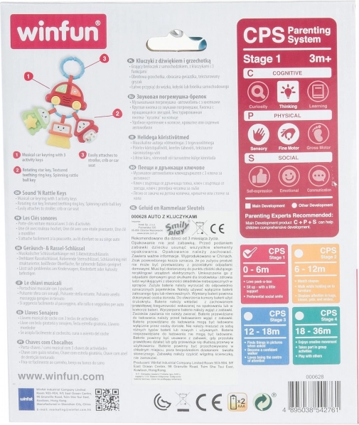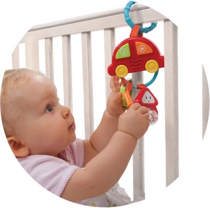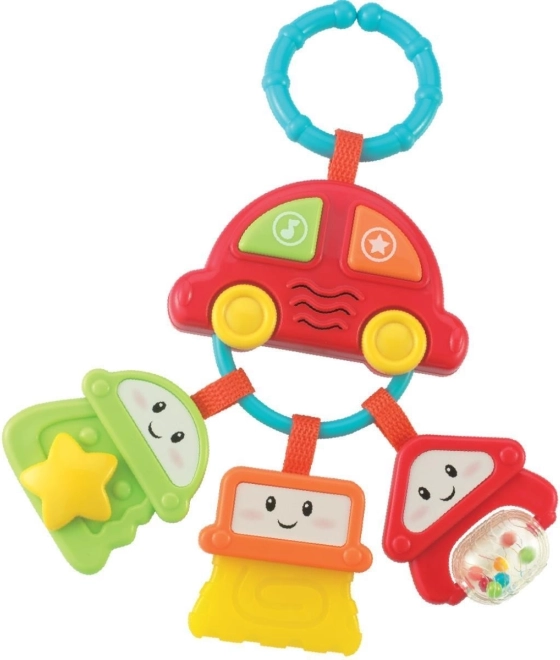 Es handelt sich um ein hängendes Auto in Form eines Schlüsselbunds mit drei Schlüsseln. Es enthält zwei bunte Funktionstasten, die verschiedene Klänge, Effekte und lustige Melodien auslösen.