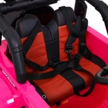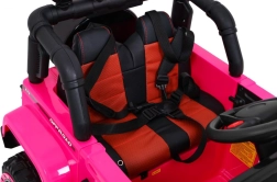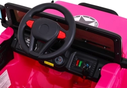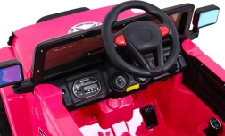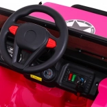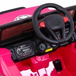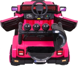 Eltern schätzen die 2,4-GHz-Fernbedienung mit drei Geschwindigkeiten und der Sicherheitstaste STOP. Der Innenraum bietet einen bequemen Sitz mit 5-Punkt-Gurten, zu öffnende Türen mit Verriegelung und ein funktionsreiches Audio-Panel mit MP3, USB, SD und AUX-Eingang sowie vorinstallierten Melodien. Das praktische Fach im hinteren Reserverad nimmt Kleinigkeiten für unterwegs auf.
