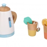 Nehmen Sie an einer Teeparty teil mit dem Holz-Teeservice, das eine Kanne, Tassen und Zubehör wie Zitronenscheiben und Teebeutel umfasst.