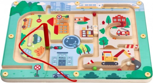 Magnetisches Labyrinth Fahrzeuge ist ein ideales pädagogisches Spielzeug für Kinder ab 18 Monaten, das die Feinmotorik und Problemlösungsfähigkeiten durch das spielerische Bewegen eines magnetischen Stabes durch ein Holzlabyrinth voller bunter Stadtillustrationen fördert.