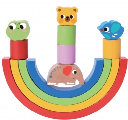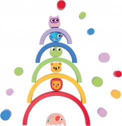 Dieses vielseitige Holz-Steck- und Stapelspiel bietet endlose Spielmöglichkeiten. Kinder können aus bunten Bögen Türme, Brücken und Bahnen bauen, mit den Tierchen balancieren und die Konzentration trainieren. Die Kombination aus Regenbogen-Halbkreisen und Figuren fördert die Kreativität und vermittelt logisches Denken sowie räumliche Vorstellungskraft.