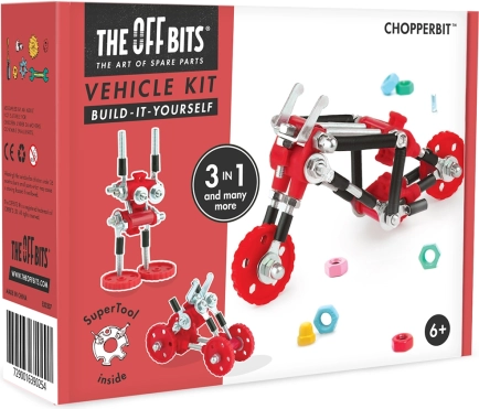 Das The OffBits ChopperBit Bauset bringt kreatives und lehrreiches Bauen für Kinder ab 6 Jahren. Aus den beiliegenden Schrauben, Rädern und cleveren Verbindern baust du den ChopperBit, den Roboter TechBit oder den BumperBit – und anschließend kannst du dich an eigene originelle Ideen wagen. Die Teile lassen sich mit üblichen Haushaltsmaterialien kombinieren, sodass der Kreativität keine Grenzen gesetzt sind.