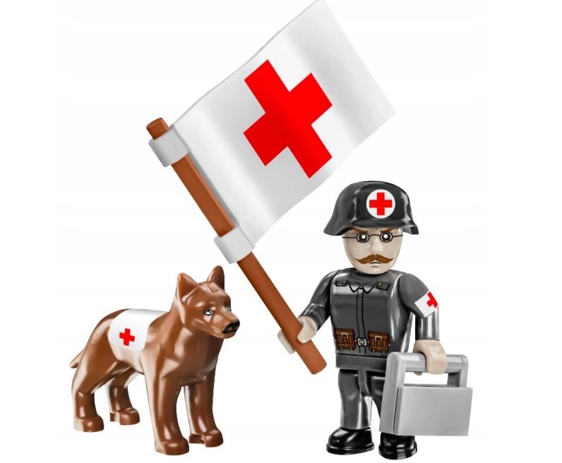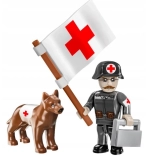 Spezielle Minifigur eines deutschen Sanitäters mit Rotkreuz-Flagge und Sanitätstasche, ergänzt durch einen Rettungshund mit Emblem.