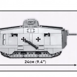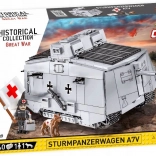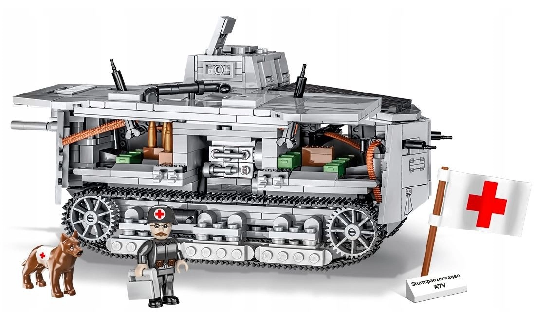 Entdecken Sie den ikonischen Panzer Sturmpanzerwagen A7V aus der Zeit des Ersten Weltkriegs als präzisen COBI-Baukasten. Das Modell im Maßstab 1:35 bietet 840 Teile, ein detailliertes Interieur, bewegliche Ketten, drehbare Geschützläufe sowie dauerhafte Drucke ohne Aufkleber. Inklusive Sanitäter mit Rotkreuz-Flagge und Rettungshund für authentische Frontszenarien.