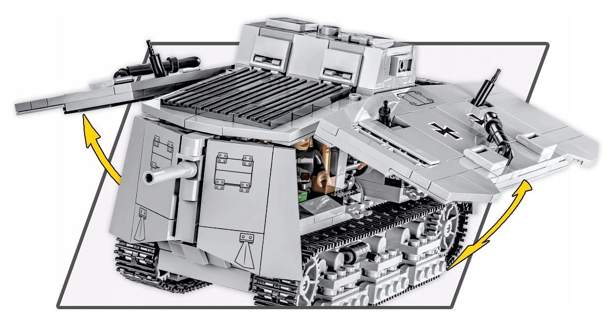 Die Seitenteile lassen sich öffnen und geben den Zugang zum Innenraum frei. Die Ketten sind vollständig beweglich, Geschütz- und MG-Läufe lassen sich für dynamische Szenen drehen.