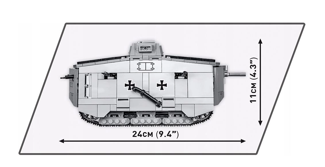 Getreue Nachbildung des historischen Sturmpanzerwagen A7V mit originalgetreuen Formen, Proportionen und Drucken ohne Aufkleber. Ideal für Sammler und WWI-Enthusiasten.