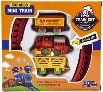 Uhrwerkzug mit zwei Wagen und Gleisen