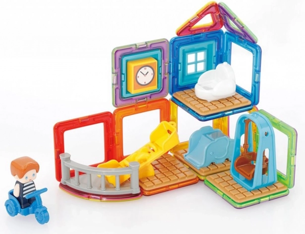 Viel Spaß mit Max und seinem Spielplatz. Das kreative magnetische Konstruktionsset ermöglicht das Bauen zahlreicher dreidimensionaler Objekte mithilfe zweidimensionaler Kunststoff-Polygone. Magformers fördert die Feinmotorik, regt die Kreativität an und bringt Kindern Farben sowie grundlegende geometrische Formen bei. Die Abmessungen der Teile und die sorgfältig gewählten Formen gewährleisten maximale Sicherheit des Spielzeugs. Das Material, aus dem das Set hergestellt ist, erfüllt die strengsten Hygiene- und Gesundheitskriterien. Die Teile sind ausreichend groß, können nicht verschluckt werden und sind praktisch unzerbrechlich. Verpackungsinhalt: