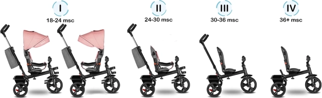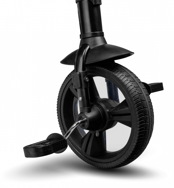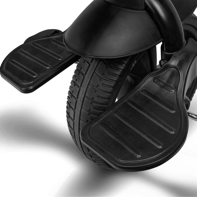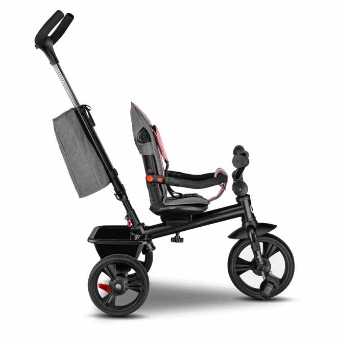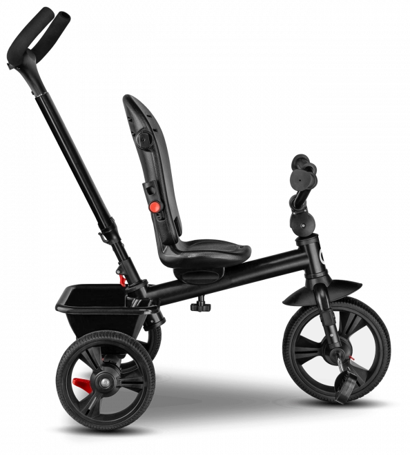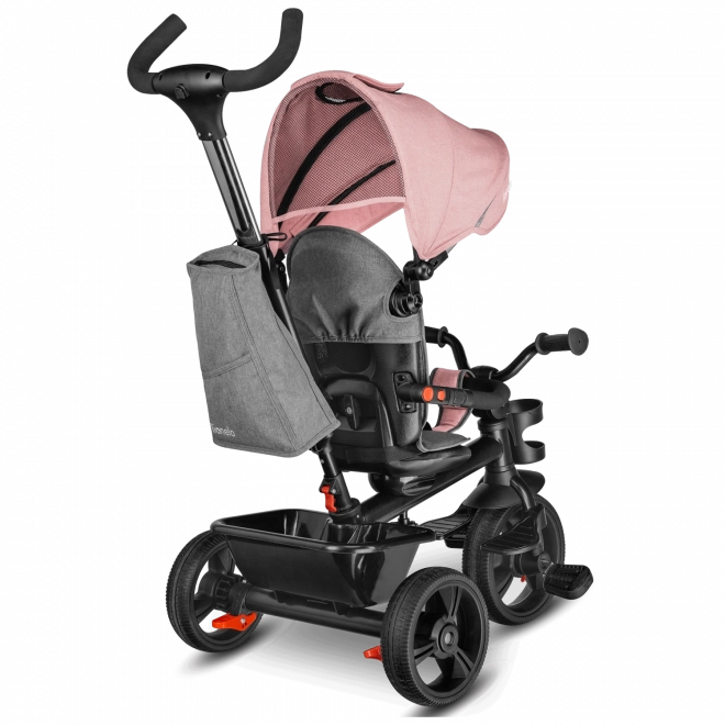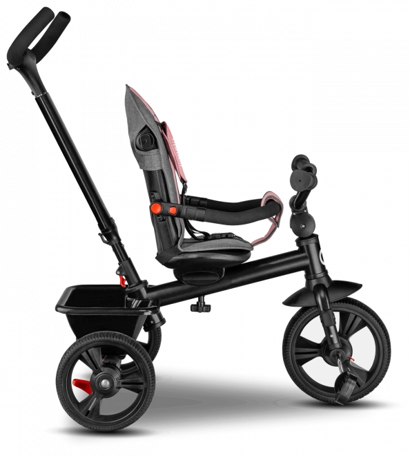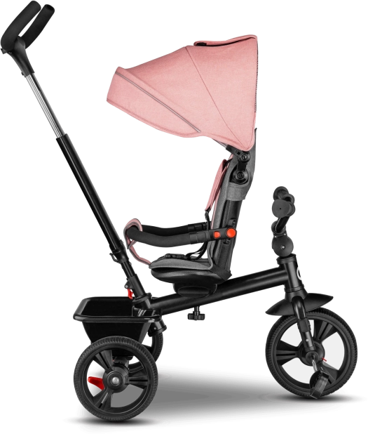 Für maximalen Komfort gibt es ein verstellbares Verdeck mit Sichtfenster, einen höhenverstellbaren Schiebegriff für Eltern sowie praktisches Zubehör – Korb, Tasche und Flaschenhalter. Die Sicherheit erhöhen 3-Punkt-Gurte, ein Schutzbügel, reflektierende Elemente und zwei unabhängige hintere Bremssysteme. Das Dreirad lässt sich leicht zu einer kompakten Größe zusammenklappen und dank des integrierten Tragegriffs bequem transportieren.