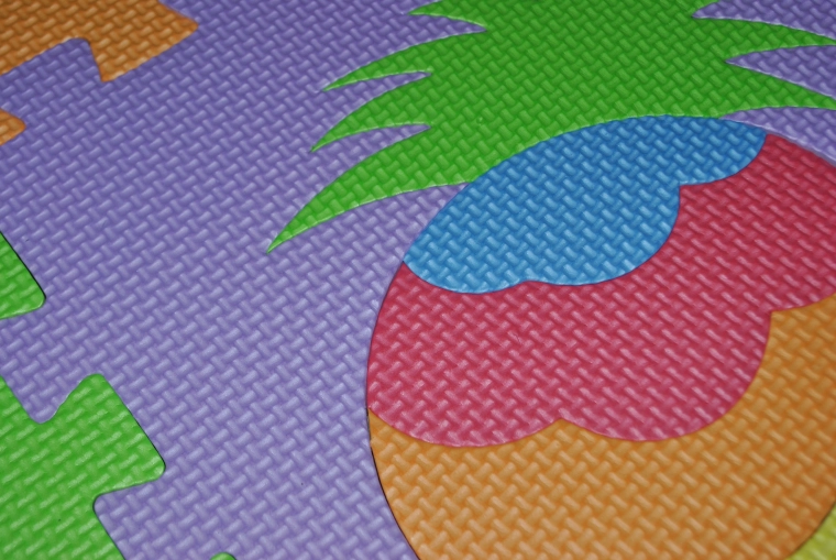 Schaumstoff-Puzzle mit verschiedenen Obstmotiven und herausnehmbaren Teilen für Kinder ab 3 Jahren.