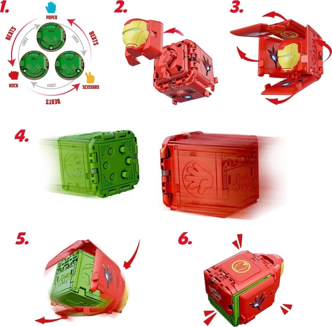 Jeder Würfel verbirgt deine Schere–Stein–Papier-Wahl hinter der ikonischen Maske eines Superhelden. Das stylische Design begeistert MARVEL-Fans und Sammler.