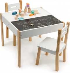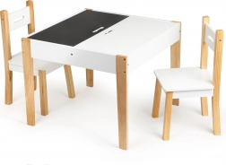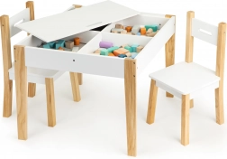 Nach dem Spielen können alle Spielzeuge einfach unter der abnehmbaren Tischplatte organisiert werden. Das Set enthält zwei bequeme Stühle mit Kiefernholzbeinen.