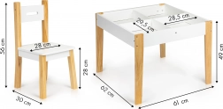 Ein großartiges Set für Ihr Kind, das dank seines einfachen Designs perfekt in jedes Kinderzimmer passt. Der Tisch hat Kiefernholzbeine, die Stabilität gewährleisten, und eine MDF-Platte, die pflegeleicht und widerstandsfähig gegen Beschädigungen ist.