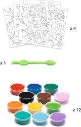Erschaffen Sie ein einzigartiges und farbenreiches Kunstwerk mit zw36lf verschiedenen bunten Sanden und einem speziellen Werkzeug.