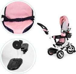 Das Dreirad besitzt robuste Räder, die Fahrten auf unebenem Boden ermöglichen, und ein Bremssystem an den hinteren Rädern verhindert ungewollte Bewegungen des Dreirads. Einklappbare Fußstützen ermöglichen bequemes Fahren auch für die kleinsten Kinder.