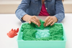 Enthalten sind 454 g grüner Sand, Formen für Meerestiere und eine Burg sowie eine Schaufel zum Graben, Schöpfen und Streuen. Der Sand besteht aus natürlichem Sand und ist eine tolle Alternative zu Knetmasse – fördert Feinmotorik, Kreativität und selbstständiges Spielen.