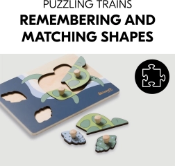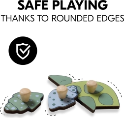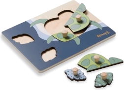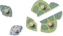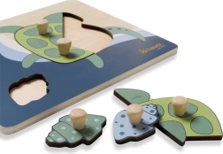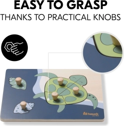 Das Holzpuzzle mit Griffen Turtle ist für kleine Kinderhände konzipiert. Jedes Teil hat einen Holzknopf für einfaches Greifen und genaues Einsetzen. Beim Puzzeln trainiert das Kind die Feinmotorik, die Koordination von Auge und Hand, das Gedächtnis sowie das Erkennen von Formen und Farben. Abgerundete Kanten gewährleisten sicheres Spielen bereits ab 12 Monaten.