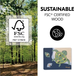 Das Spielzeug besteht aus FSC-zertifiziertem Holz, ist somit umweltfreundlich und langlebig für den täglichen Gebrauch. Die sanfte Palette aus Grün- und Blautönen weckt Neugier und wirkt zugleich beruhigend.