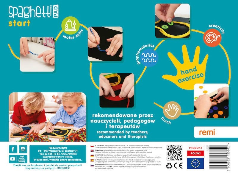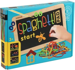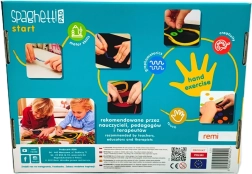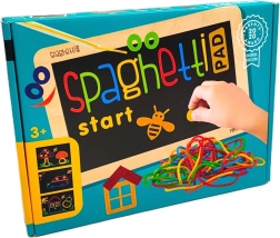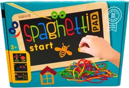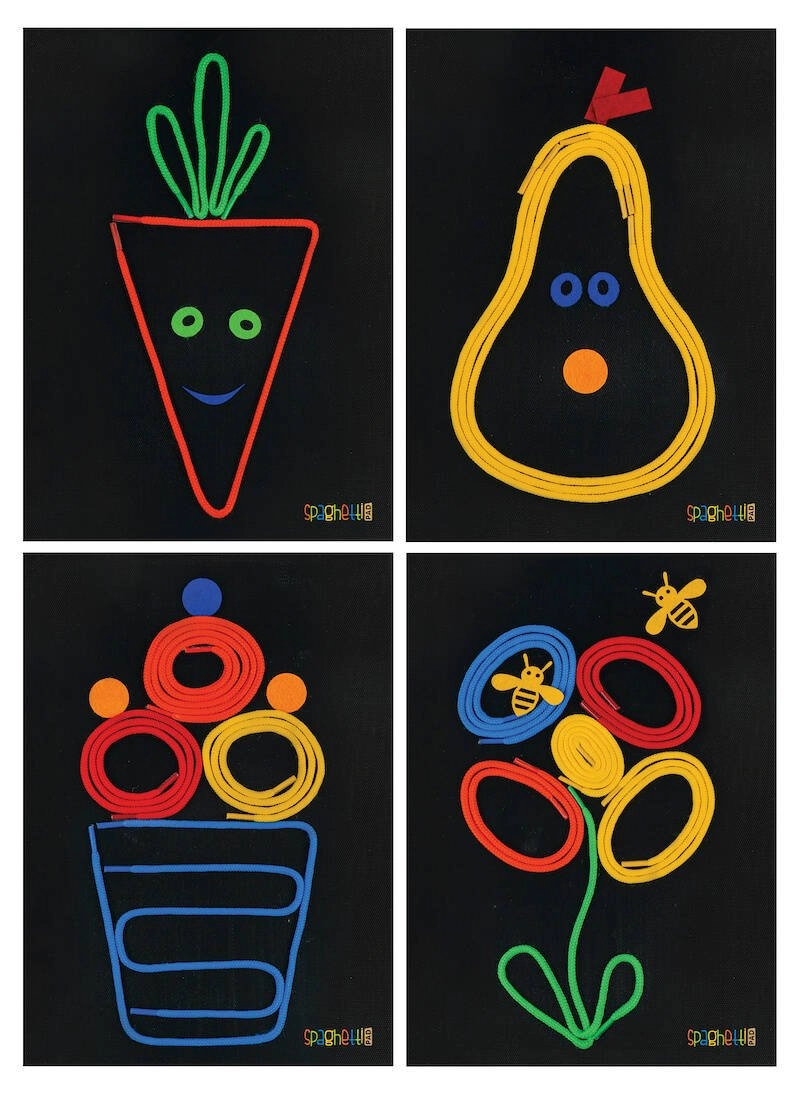 Das Spaghetti-Set ist ein cleveres und unterhaltsames Werkzeug für kreatives Gestalten ohne Chaos. Kinder legen elastische, bunte Schnüre auf ein spezielles Board, auf dem sie haften und sich jederzeit leicht abnehmen und anpassen lassen. Mit den beiliegenden Vorlagenkarten und Filz-Elementen entstehen Bilder, Muster und Geschichten.