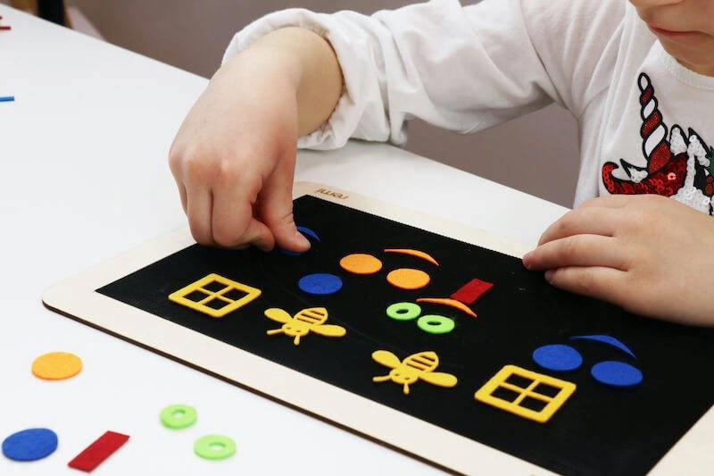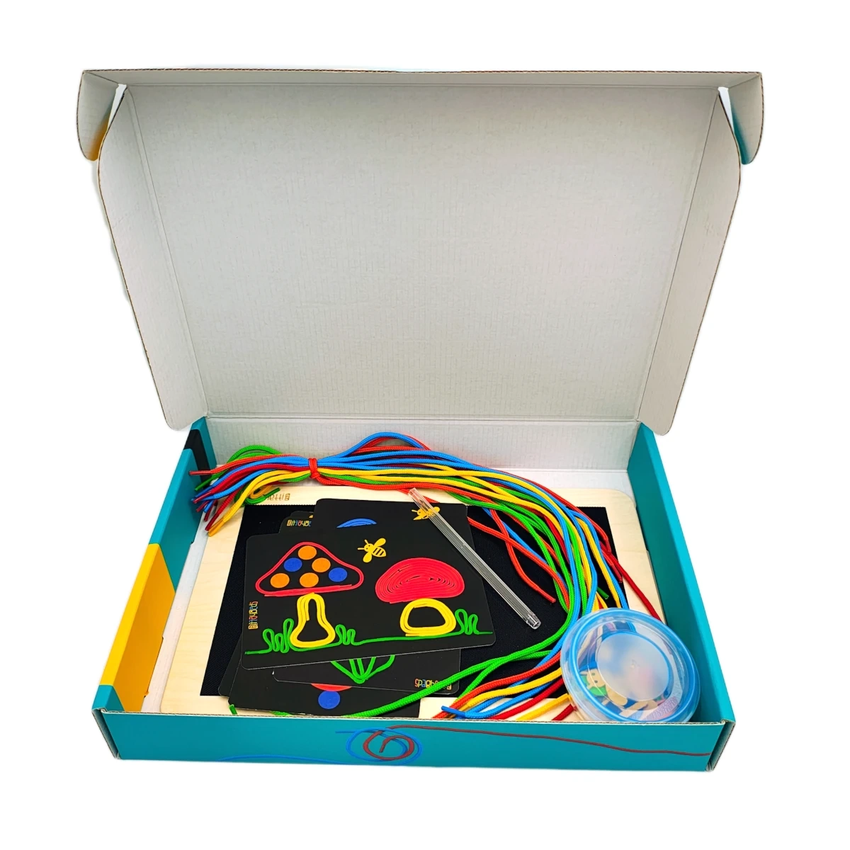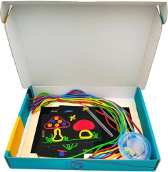 Die Arbeitsplatte mit haftender Oberfläche für Schnüre ermöglicht das einfache Legen von Formen, Linien und ganzen Bildern. Kinder gestalten frei und ohne Angst vor Fehlern – alles lässt sich jederzeit neu arrangieren.