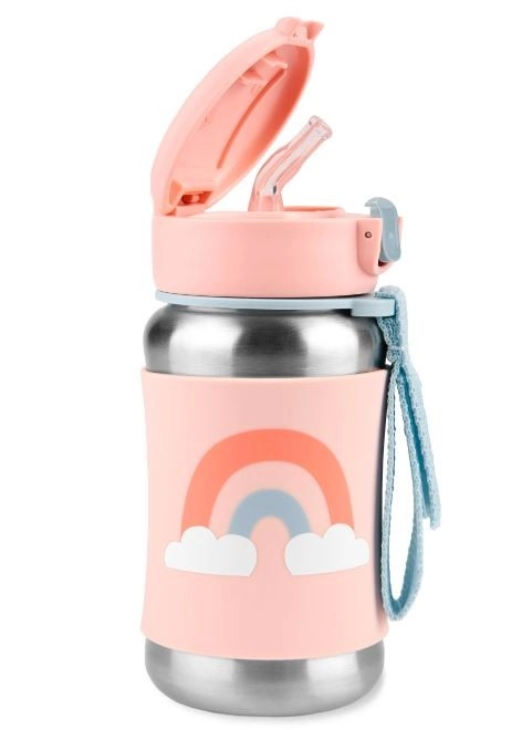 Edelstahl-Wasserflasche mit tollen Mustern, die kleinen Persönlichkeiten Glanz verleihen und Getränke unterwegs kühl halten. Der ausklappbare Deckel hält den flexiblen Strohhalm sauber, und die rutschfeste Silikonhülle schützt kleine Hände vor der Kälte der Oberfläche.