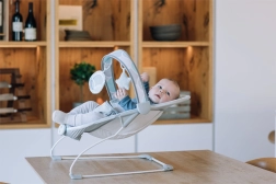 Durchdachte Details wie der abnehmbare Spielbogen mit Spielzeugen zur Förderung der Motorik und Vorstellungskraft, der 3-Punkt-Gurt für sicheren Halt im Sitz sowie der pflegeleichte, waschbare Bezug machen die Wippe zu einer praktischen Wahl für jeden Haushalt.