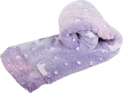 Genießen Sie maximalen Komfort mit einer superweichen Decke in elegantem Violett mit Einhorn- und Sternchenmotiv. Dank spezieller Fasern leuchten die Motive im Dunkeln, wodurch die Decke perfekt fürs Kinderzimmer und für gemütliche Abende ist. Sie ist weich, warm, beidseitig und maschinenwaschbar.