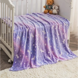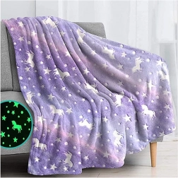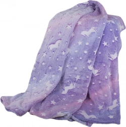 Diese weiche und warme Decke bringt eine Extraportion Gemütlichkeit in Schlafzimmer und Wohnzimmer. Violette Töne mit niedlichen Einhörnern und Sternchen wirken verspielt und behaglich. Nachts leuchten die Motive dank fluoreszierender Fasern sanft auf – ein Lieblingsstück für Kinder und alle, die eine magische Atmosphäre lieben.