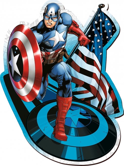 Eine dynamische Illustration mit einem Helden im Rot-Blau-Trikolore-Stil und einem Sternenschild verleiht dem Puzzeln Energie und die Atmosphäre der Comicwelt.