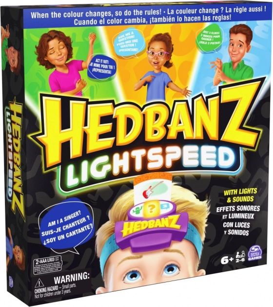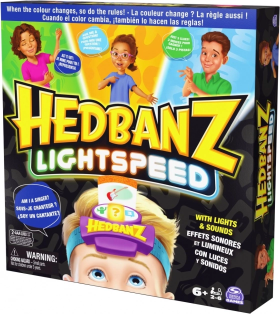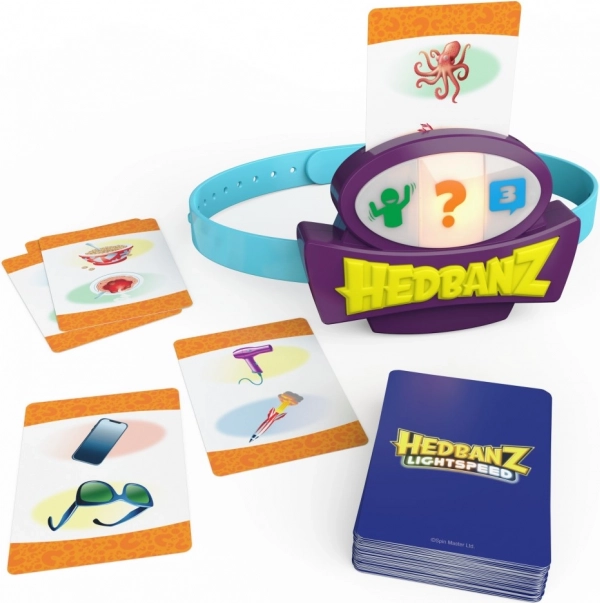 Genießen Sie das aufregende Spiel Hedbanz Lightspeed, bei dem sich die Regeln dank des dynamischen elektronischen Stirnbands mit drei Farben ständig ändern. Stellen Sie sich eine Szene vor, antworten Sie in Lichtgeschwindigkeit oder verwenden Sie drei Hinweise, je nach Farbe, die das Stirnband gerade zeigt.