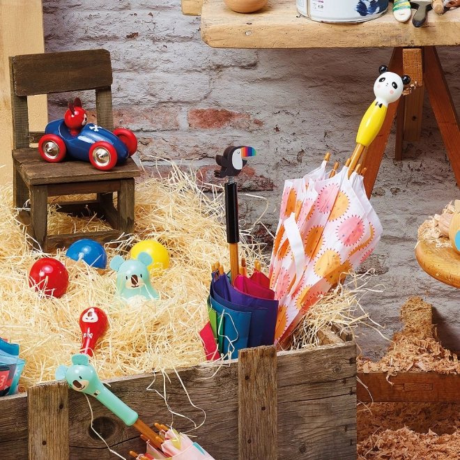 Machen Sie graue Regentage bunter mit diesem stylischen Kinder-Regenschirm mit einer fröhlichen Tukan-Knopfspitze und Regenbogen-Print. Die hochwertige Metallkonstruktion und der Holzgriff sorgen für angenehmen Halt und Langlebigkeit. Design ANDY WESTFACE, hergestellt in Frankreich.