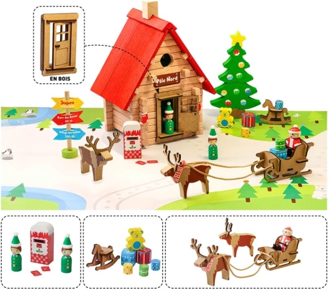 Dieses Themen-Set bringt die Atmosphäre des Nordpols direkt ins Kinderzimmer. Bauen Sie Santas Hütte, platzieren Sie die Wichtel-Figuren, spannen Sie die Rentiere vor den Schlitten und schmücken Sie die Szene mit einem Weihnachtsbaum samt Geschenken. Dank passgenauer Holzteile macht das Bauen Spaß und fördert Feinmotorik, Geduld und Kreativität.