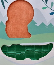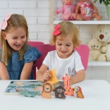 Kinder können Geschichten mit Tieren wie Giraffe, Löwe, Affe und Alligator kreieren, was ihre Kreativität fördert.