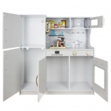 Diese XL-Holzspielküche ist für stundenlangen Spielspaß konzipiert. Die integrierte LED-Beleuchtung lässt sich nach Wunsch unter dem Schrank, im Schrank oder im Ofen platzieren, und die drehbaren Schalter mit Klickgeräusch vermitteln das Gefühl echten Kochens. Die robuste MDF-Konstruktion und das elegante weiß-goldene Design werden zum Hingucker im Kinderzimmer.