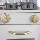 Die stylische XL-Holzspielküche der Marke KRUZZEL in Weiß mit goldenen Details bietet dank LED-Beleuchtung, Herdgeräuschen und umfangreichem Zubehörset ein realistisches Spielerlebnis. Die stabile Holzkonstruktion, funktionsfähige Türen mit Klickverschluss, ein herausnehmbares Spülbecken sowie Geräte wie Ofen und Mikrowelle fördern kreatives Spiel und die Feinmotorik.