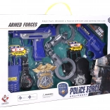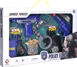 Im Lieferumfang ist eine vollständige Ausstattung enthalten: Maschinenpistole und Pistole mit jeweils 18 cm Länge, praktisches Pistolenholster, funktionierende Handschellen mit Schlüssel, stylisches Funkgerät, Uhr und Polizeiabzeichen. Batterien sind enthalten, sodass nichts nachgekauft werden muss.