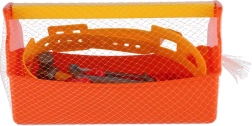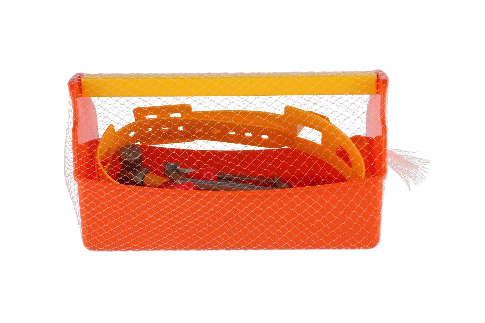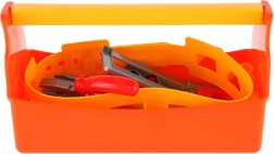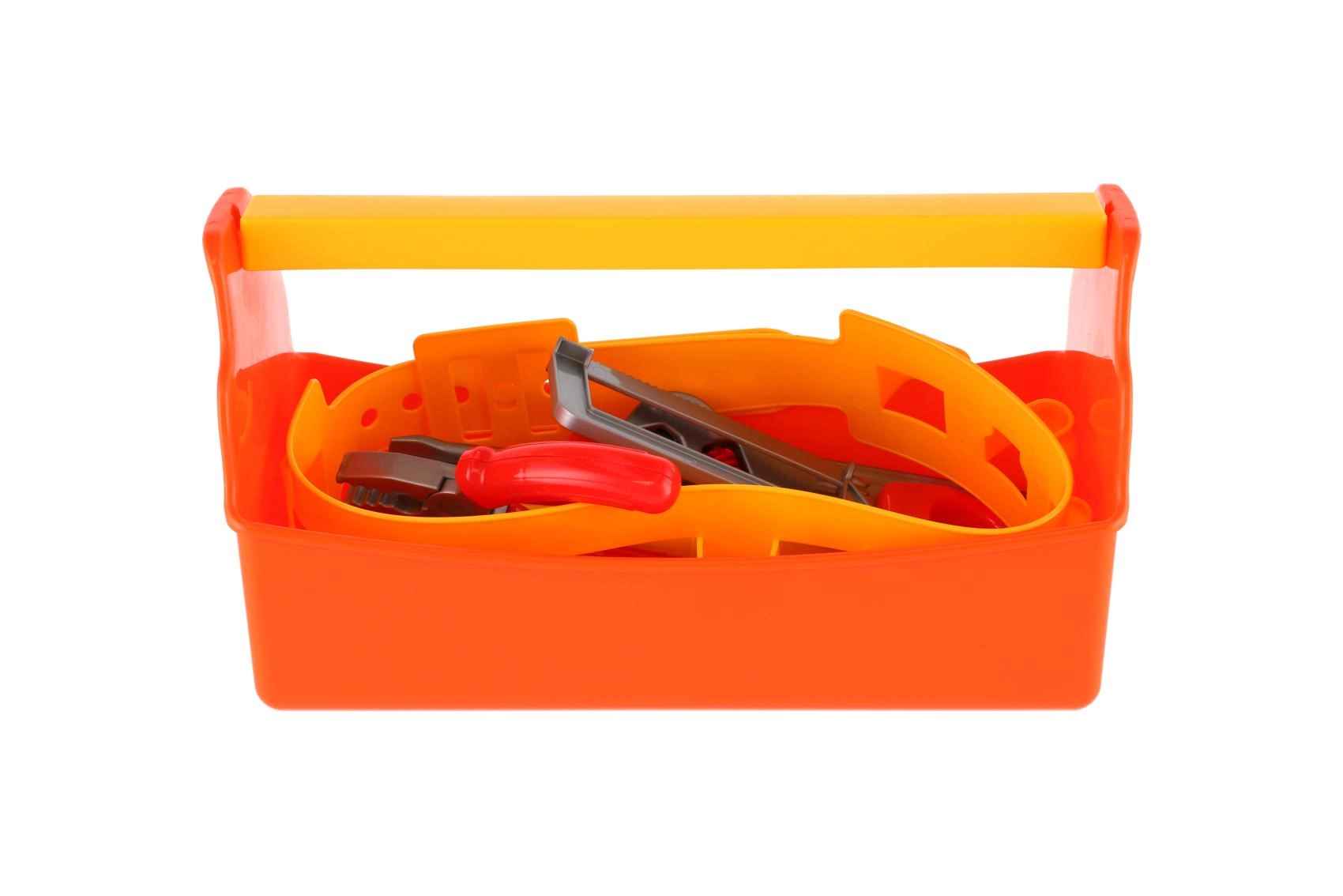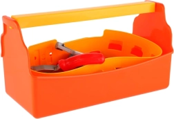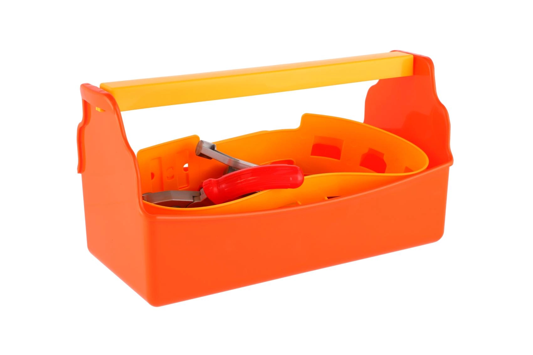 Die orangefarbene Kunststoffkiste mit stabilem gelbem Griff und Innenfach hält alle Werkzeuge übersichtlich an einem Ort und kann von Kindern leicht getragen werden.