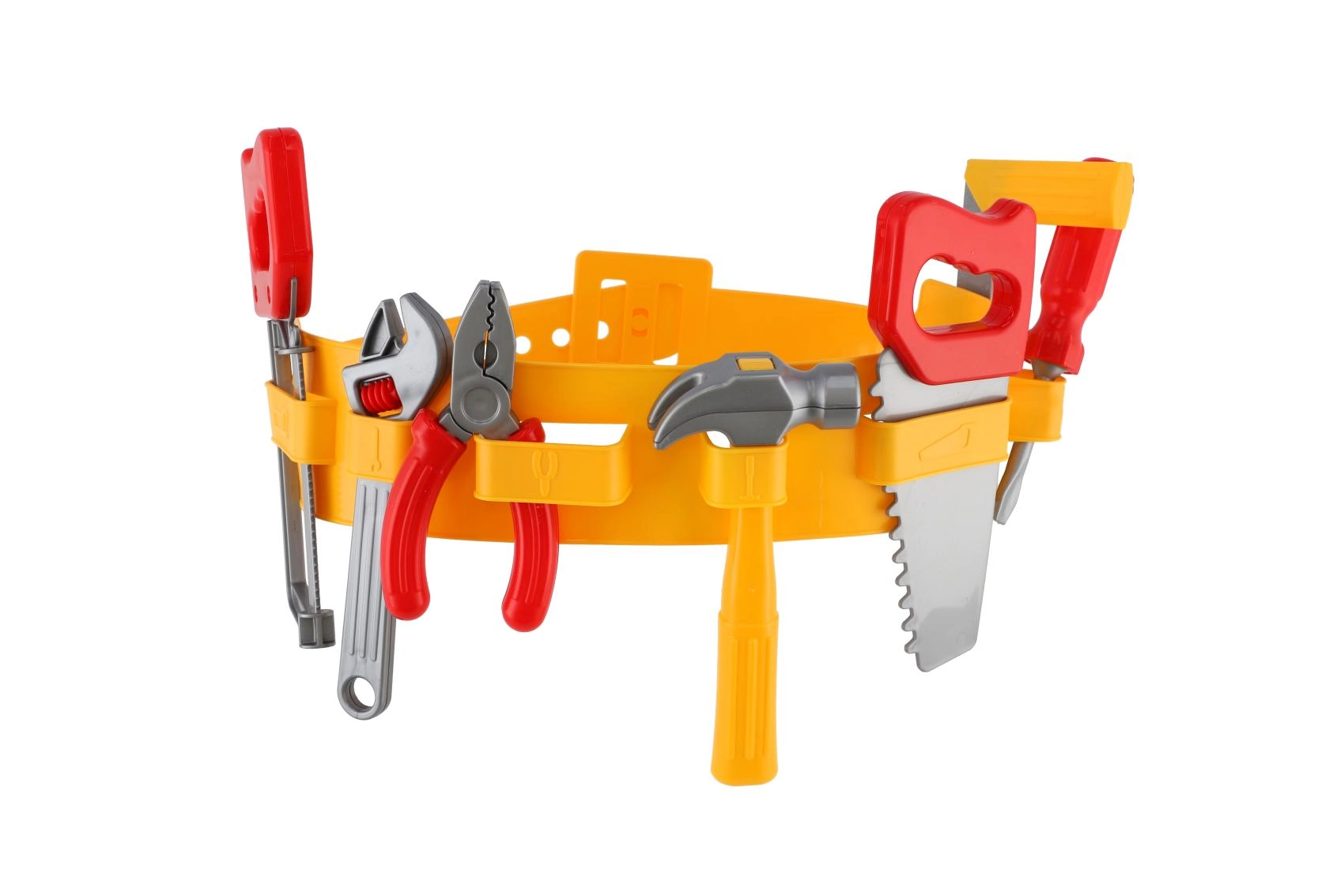Der gelbe Kindergürtel mit Werkzeughaltern ermöglicht kleinen Reparateurinnen und Reparaturen, Hammer, Schraubendreher oder Schlüssel stets bei sich zu tragen und noch realistischer zu spielen.