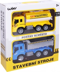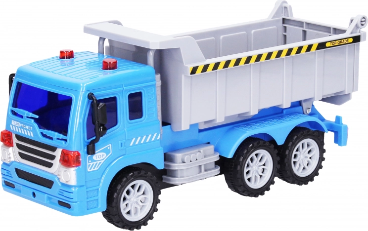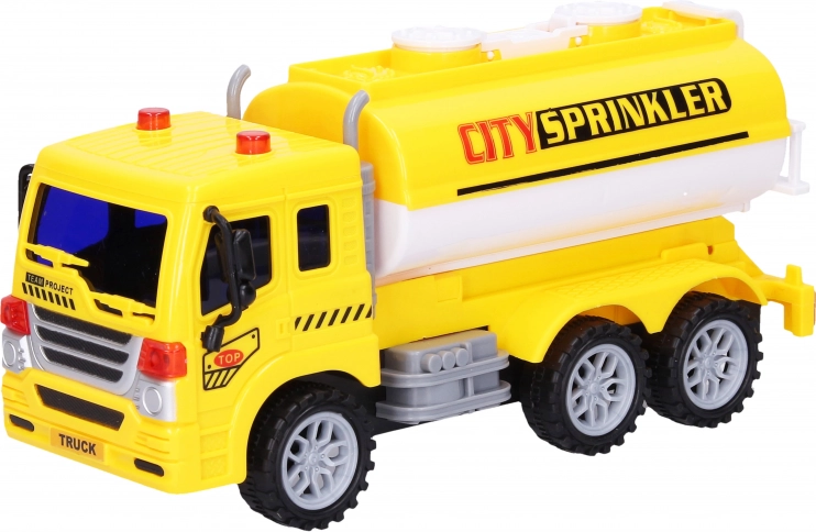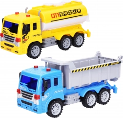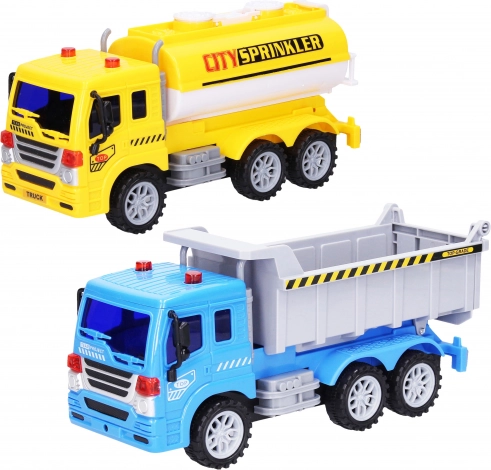 Ein lustiges Set für kleine Fahrer enthält einen Kipper, eine Tankwagen und Verkehrszeichen mit einer Länge von 25 cm. Die Fahrzeuge fahren mit Schwungrad, lassen sich leicht steuern und bieten viel Actionspaß sowie das Lernen der Verkehrsregeln.