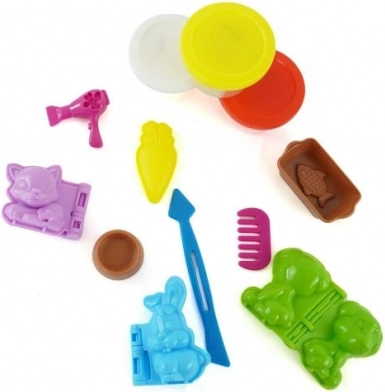 3 Dosen Modelliermasse, 3 Tierformen, Schale, 2 Nahrungsformen für Tiere, Kamm, Föhn und Scherchen