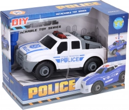 Unterhaltsames Bauset für Kinder: schraubbarer Polizei-Pick-up mit 17 cm Länge und frei drehenden Rädern. Im Set enthalten sind Fahrzeug und Kreuzschraubendreher mit praktischem Mutternschlüssel im Griff. Verfügbar in 2 Farbvarianten – Weiß und Blau.