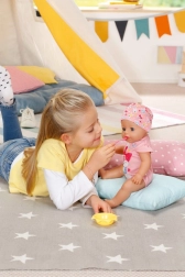 Entdecken Sie die realistische Puppe BABY born mit Zauberschnuller in der Größe 43 cm, die nach dem Drehen des Schnullers im Mund in jeder Position die Augen öffnet und schließt. Dank des weichen Soft Touch-Körpers ist sie kuschelig, trinkt aus der Flasche, isst Brei, macht Pipi in die Windel oder auf das Töpfchen, weint Tränchen und kann sogar groß machen – ganz ohne Batterien. Enthalten sind 10 Zubehörteile für interaktives Spiel sowie zur Förderung von Fantasie, Empathie und Verantwortungsbewusstsein.