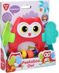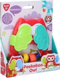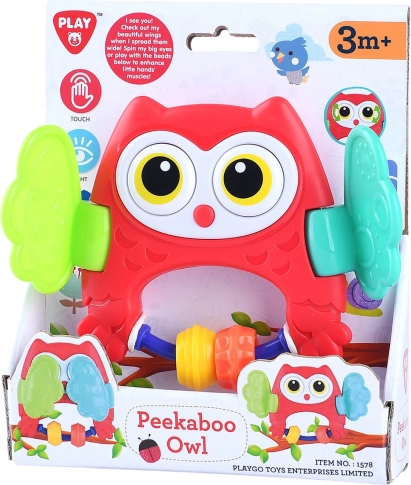 Lustige Playgo Eule, die ihre Augen bedeckt und ein interaktives Spielzeug für Kinder bietet. Ihre sich bewegenden Flügel und drehenden Augen ziehen die Aufmerksamkeit jedes Kindes auf sich.