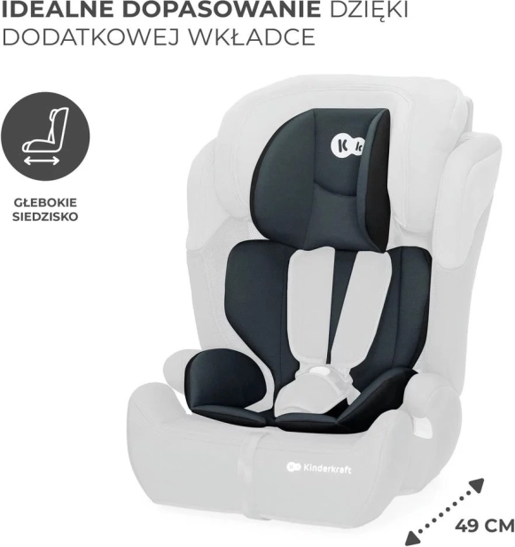 Die gleichzeitige Verstellung von Kopfstütze und Gurten ermöglicht es, den Sitz schnell an das wachsende Kind anzupassen. Die breite Sitzfläche und die Einlage für kleinere Kinder gewährleisten eine korrekte Positionierung.