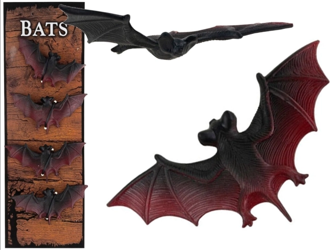 Schaffen Sie im Handumdrehen eine gruselige Halloween-Atmosphäre! Dieses Set aus 4 realistischen Fledermäusen aus strapazierfähigem Kunststoff/Gummi ist ideal zur Dekoration von Haus, Garten und Partys. Hängen Sie sie einfach an einen Ast, in ein Spinnennetz oder auf ein Regal und erhalten Sie effektvolle Dekorationen mit markanten schwarz‑roten Flügeln.