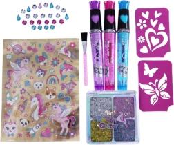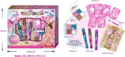 Erstaunliches Tattoostudio für Kinder, das es ermöglicht, Haare und Körper mit bunten Mustern und Steinchen zu verzieren.