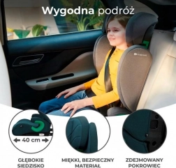 Der Sitz ist breit und bequem, hergestellt aus weichen Materialien hoher Qualität. Das Kind wird sich sowohl auf kurzen als auch auf langen Fahrten wohlfühlen. Der Bezug ist leicht abnehmbar und waschbar, was den Sitz langfristig sauber hält.