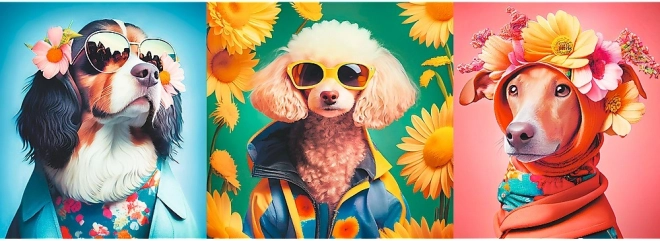 Drei stilvoll gekleidete Hunde mit Sonnenbrillen und Blumen vor buntem Hintergrund ergeben ein verspieltes Bild, das jeden Raum erstrahlen lässt.