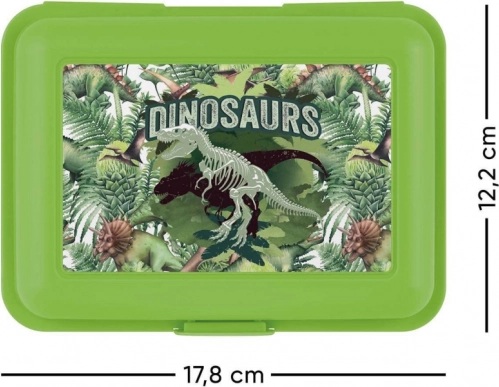 Lunchbox BAAGL Dinosaurier in grüner Farbe ist dank seines attraktiven Designs mit Dinosauriern und praktischer Ausführung mit Trennfach die ideale Wahl für Kinder.
